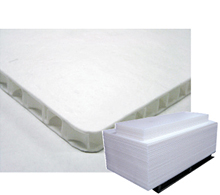 プラパールは、真空成形された「キャップ」とよばれる円柱成形シートを上下からシートで挟んだ、軽量で剛性が高く平面圧縮強度に優れたプラスチックボードです。燃やしてもダイオキシンや塩化水素などの有害ガスを発生させないポリエチレン製なので、環境にやさしく、リサイクル性にも優れています。